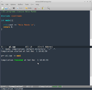 Al crear un archivo fuente en Emacs por ejemplo prog.cpp, emacs activa en modo editor de código C++. Para compilar el código fuente en C++, Emacs se apoya en el compilador GNU g++.